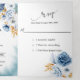 Esta elegante invitación de boda floral triptico en azul polvoriento, blanco y dorado ofrece una forma sofisticada e integral de invitar a los invitados a su día especial. El diseño triptico proporciona un amplio espacio para detallar toda la información esencial de la boda, desde los detalles específicos de la ceremonia y la recepción hasta los detalles de alojamiento y las opciones de RSVP, mientras muestra un hermoso motivo floral en azul polvoriento sereno y lujosos acentos dorados. Es una elección elegante y práctica para parejas que buscan una invitación de boda integral y memorable.