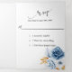 Esta elegante tarjeta de anuncio de boda floral en azul polvoriento, blanco y dorado de tres solapas ofrece una forma sofisticada e integral de invitar a los invitados a su día especial. El diseño de tres solapas proporciona un amplio espacio para detallar toda la información esencial de la boda, desde los detalles específicos de la ceremonia y la recepción hasta los detalles de alojamiento y las opciones de RSVP, mientras muestra un hermoso motivo floral en azul polvoriento sereno y lujosos acentos dorados. Es una opción elegante y práctica para parejas que buscan una invitación de boda integral y memorable.