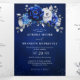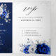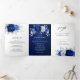 Invitación de boda elegante de tres solapas con tema azul real, plata y blanco con un ramo elegante de flores de rosa de color azul real, azul marino, plata y blanco puro y hojas de eucalipto verde grisáceo. Por favor, contácteme para cualquier ayuda en personalización o si necesita cualquier otro producto con este diseño.