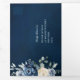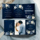 Invitación Tri-Plegable de boda floral azul polvoriento con un elegante ramo de azul marino, azul real, blanco, dorado, champán marfil, rosa color rosa, capullos de flores de ranunculus y hojas de eucalipto verde salvia y ramo de acuarela elegante. Por favor, contácteme para cualquier ayuda en personalización o si necesita cualquier otro producto con este diseño.