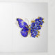Jewelry, blue, sapphire, sparkling flower butterfly with wing decorated with blue, precious flowers with gold leaves on white background.