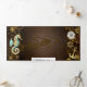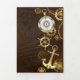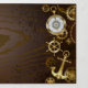 Fondo de madera marrón con mar, cresta mecánica, volante antiguo, ancla dorada y varios engranajes de oro y latón. Estilo Steampunk.