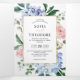Invitación de boda moderna con hortensias acuarela azul claro/azul polvoriento con rosas pastel rosa, rubor, melocotón, blancas, peonías, hojas de eucalipto salvia, ramas y follaje. Tonos románticos suaves y soñadores, diseños florales de acuarela de primavera y verano para combinar con la temática de su boda. Por favor, busque más diseños y variaciones coincidentes en mi tienda "blissweddingpaperie". Y no dude en contactarme para una mayor personalización o artículos coincidentes.