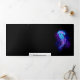 Gran medusa azul, de dibujo artístico, brillante y brillante, con largos tentáculos sobre fondo negro con bioluminiscencia violeta. Luminosas medusas.