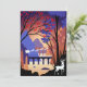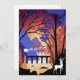 Santa and his reindeer soar across a moonlit bridge surrounded by magical forests and shimmering leaves. A stunning Christmas holiday vibe bathed in deep violet, gold, and sunset orange hues.