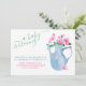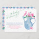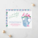 Tarjeta de invitación del embarazo, simple y neutra en función del género. Este dulce diseño dice "un bebé se está preparando" en una tipografía con letras a mano con flores de cerezo rosa bonito, que se está preparando en una olla de café azul. La parte trasera de la tarjeta tiene un cheque de gingham azul repartido con más flores rosas. Con letras rosas y azules, el poema de la invitación de bebé y el mensaje del personalizado son completamente editables. El texto de la muestra dice "rosa o azul, no tenemos idea, todo lo que sabemos es que nuestro bebé debe llegar" "[nombre del bebé] debe llegar al lóbulo [fecha de nacimiento] [su nombre(s)]. Comparte la emoción y deja que todos sepan que estás esperando un bebé.