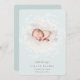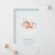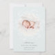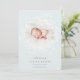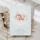 Elegante anuncio de nacimiento en colores suaves presenta una foto redonda de recién nacidos rodeada por una corona de ramas y hojas botánicas blancas, con "presentando [Nombre]" en la parte inferior con letras grises de moda. Personalice con la fecha de nacimiento del bebé, y las estadísticas de nacimiento debajo, y agregue un mensaje personal a la parte de atrás, junto con una foto adicional.
