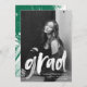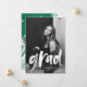 Tarjeta de agradecimiento para graduación moderna que presenta la foto del graduado con "grad" en un guión de pincel blanco. Personalice la parte delantera de la tarjeta de agradecimiento de graduación agregando el nombre del graduado, la escuela, el nombre y el año de graduación. En la parte posterior de la tarjeta hay espacio para el mensaje escrito a mano o con tipeado con un fondo de pinceladas verdes pintadas.