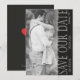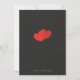 Un clásico Save the Date en negro y blanco con un diseño de texto vertical; la parte trasera es negra con corazones rojos dobles. Varias formas disponibles; no todas se ajustan a este diseño.