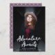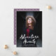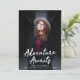 Anuncios de graduación a la moda mostrando la foto vertical del graduado con "Adventure Awaits" en letras manuscritas blancas. Personalice la parte delantera de la Adventure Aits con los anuncios de graduación añadiendo el nombre del graduado, el nombre de la escuela y el año de graduación. La invitación se invierte para mostrar un elegante patrón de enrejado morado y blanco.