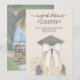 This Whimsical Calligraphy Graduation Bow Photo Announcement features a beautiful, hand-painted watercolor sketch of a graduate from a back-view perspective. The design highlights a stylish black mortarboard adorned with a delicate border of white pearls and a stunning, oversized fabric bow with long, flowing tails. To complete the look, the graduate holds a lush bouquet of creamy white roses.