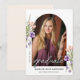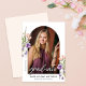This photo graduation announcement is accented with peach and purple wildflowers and lush greenery. The elegant layout offers space a photo of the graduate.