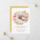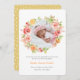 Elegante tarjeta de plantilla de anuncio de nacimiento con ilustraciones florales de rosas rosas rosas rosas, lavanda, cítricos naranjas y follaje verde en la parte delantera. La parte trasera revela un fondo amarillo de puntos polka. En la parte delantera, una imagen de su recién nacido que se puede añadir a esta tarjeta. Usar una imagen de tamaño cuadrado para un ajuste sencillo. El papel presenta preciosos bordes redondos. Tarjeta perfecta para anunciar la llegada de su recién nacido con sus estadísticas de nacimiento. Genial tanto para el niño como para el chica. ¡Ideal para las estaciones de verano y primavera!