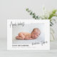 Y el bebé hace tres anuncios de nacimiento modernos con fotos. Con un texto de escritura moderno y un respaldo de color personalizable. Parte de una colección.