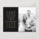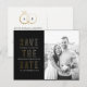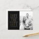 Una simple y moderna salve la postal de fecha con acentos clásicos en negro, blanco y oro falso hace que tu foto de compromiso resalte y envía a tu boda invitado la información que necesitan para planear con anticipación la celebración de tu boda con un monograma de pareja de moda dentro de anillos de boda entrelazados. Un texto fácil de personalizar hace de esta postal una elección inteligente!