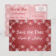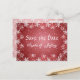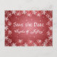 Copos de nieve blancos y rojos sobre estrellas brillantes rojas y fondo nevado Boda Salvar la postal de la fecha. Hay elementos coincidentes como franqueo, pegatina, etiqueta, botón. Sólo revisa mi tienda.