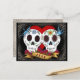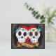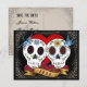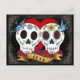 Dos pequeños y felices cráneos de azúcar, prototipos de tatuajes y rosas y una pancarta que dice "Amor". ¡No se vuelve más romántico que esto! Personalizar esta tarjeta postal para su fiesta o boda con la temática Día de los Muertos. ¡También funciona como una tarjeta El día de San Valentín única!