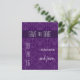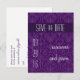 Un hermoso patrón de damasco inspirado en el arte deco en violeta morado sirve como un bonito fondo para esta postal de Save the Date. El mensaje principal destaca en un panel violeta profundo en la parte superior. Añada la fecha del gran evento a la izquierda con los nombres de la pareja a la derecha y la información detallada al revés. Una gran alternativa barata para guardar el anuncio de la fecha. Disponible en colores alternativos con productos coincidentes. com