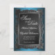 Anuncios de aviso de fecha de boda con un tema gótico que incluye una impresión de una imagen de un marco gris de estilo metálico ornamentado en la parte frontal, con un gradiente de azul a negro y la fecha de la boda sobre negro. Ideales para bodas de Halloween, góticas o con tema. Estos anuncios están diseñados para coincidir con las invitaciones de boda de marco gótico azul (artículos vendidos por separado):