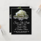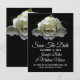 Precioso anuncio de aviso de fecha de boda con una fotografía de un capullo de rosa blanca cubierta de rocío, sobre un fondo negro. Personalice el texto según sus necesidades. Una excelente manera de notificar a todos con mucha anticipación, su próxima boda en el destino.