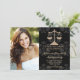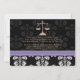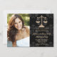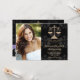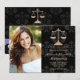 Añade tu foto o foto favorita a estos anuncios e invitaciones elegantes y formales de graduación de la escuela de derecho damasco negro con un diseño de báscula dorada de justicia y un diseño impreso de cinta púrpura. Personalizar que diga lo que quiera en la parte trasera y delante de los anuncios de graduación de la abogada y las invitaciones. Pintura © Chrissy H. Studios, LLC. Todos Los Derechos Reservados.