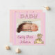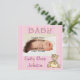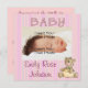 Bienvenidos a un bebé especial en el mundo con estos anuncios de natalidad fotográfica diseñados especialmente para beary. Los anuncios de nacimientos presentan un fondo rayado rosa, azul claro y verde pastel en la parte delantera con una linda y cariñosa niña de oso vestido con ropa amarillo pálido en la esquina inferior. Utilice la plantilla personalizado para insertar la foto del recién nacido y su propia redacción para la invitación especial. La parte posterior presenta un fondo sencillo y suave de color rosa con una linda oso chica vestida con su traje rosa bonito y una plantilla de texto para todos los detalles del parto. Los sobres simples se incluyen con la compra de invitaciones. Productos de coordinación: