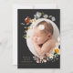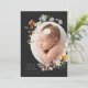 Esta elegante y moderna y elegante invitación vertical de fotografía de nacimiento es una tarjeta de doble cara de dos caras que incluye una foto ovalada de la recién nacida niña y hermosos florales de vegetación botánica enmarcando la imagen del bebé. Personaliza esta tarjeta de foto con el mensaje de tu personalizado de la familia (madre, padre, hermanos si lo deseas) que puede ser personalizada en la parte de atrás con cualquier mensaje de agradecimiento o frase de los nuevos padres. También hay una segunda foto horizontal que aparece en el reverso. Esta tarjeta de invitación para bebés presenta una paleta de colores en tonos rojos, verdes, amarillos, azules y rosas, de color negro y mutado.