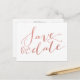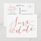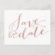 Glamour de Relieve metalizado dorado falso Rosa impreso | Boda Guardar nuestra postal de fecha. Elke Clarke © Otros colores disponibles en www.zazzle.com/monogramgallery. Un sencillo, aunque versátil, guión manuscrito rosa oro ahorra la fecha para bodas u otras ocasiones especiales como cenas de ensayo, duchas de pareja, celebraciones del aniversario de bodas. El Relieve metalizado de oro Rosa es un efecto fotográfico impreso.