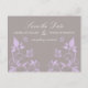 Floral de mariposa dulce y delicada salva la postal de fecha con un fondo gris turbio y mariposas violetas y adornos de viñas florales. Esta elegante tarjeta postal para guardar la fecha es la elección perfecta para anunciar su próximo boda. Fácil de personalizar, simplemente agregue los detalles de su día de boda en los campos de texto proporcionados. Haga clic en el botón "Personalizar" para encontrar opciones de personalización adicionales.