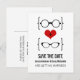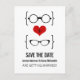 Gafas Geeky Quirky y moda Salven la postal de fecha con un corazón rojo flanqueado por dos pares de anteojos geky, una pareja masculina y una pareja de niñas que representan al novio y la novia. ¡Esta tarjeta postal de fecha, desvencijada pero sofisticada, es perfecta para anunciar a tu boda nerd! Fácil de personalizar, simplemente añada los detalles de su boda en los espacios proporcionados. Haga clic en el botón "Personalizar" para encontrar opciones de personalización adicionales.