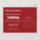 Una fotografía de un tren de ferrocarril amarillo brillante decora esta original y divertida postal de cumpleaños número 100 "Save the Date". El reverso tiene letras blancas en un fondo rojo. Puede cambiar fácilmente el texto por nombre, edad, evento, fecha, etc. ¡Asegúrese de cambiar el número de años en el lado de la foto también!. El sello postal correspondiente a las postales es el producto zazzle 172423296315787132. Foto original de Marcia Socolik. Todos los derechos reservados © 2014 Alan & Marcia Socolik.