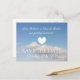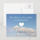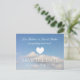 Guardar la postal del boda de fecha | cielo de nubes blancas. Fotografía de color con un cielo azul romántico con nubes blancas y corazón. Ideal para recordarle a sus bodas. Nombre de novia y novio personalizable con texto de escritura elegante.