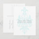 Moderno, con elegancia moda, describe esta sofisticada Damask sutil Save the Date Postcard con un fondo luminoso y turquesa de damasco. Este clásico guardar la fecha es perfecto para anunciar un boda tradicional y puede ser fácilmente personalizado con los detalles de su boda. Para obtener más opciones de personalización, haga clic en el botón Personalizar.