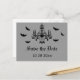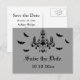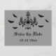 Una araña espeluznante y un grupo de murciélagos acentúan esta postal de Halloween Guardar la fecha.
