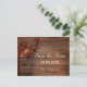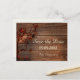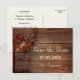 Bonita postal romántica Save the Date con un árbol con hojas de colores, rosas y lámparas de luz de velas en un fondo rústico de madera