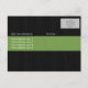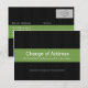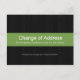 Estos ambiciosos y modernos cambios de las tarjetas de visita tienen un fondo de madera oscura. En la parte delantera, encajonada en la madera, hay una franja verde. El texto de arriba dice "Cambio de dirección", y es completamente personalizable. ¡Cambia esto a lo que nos hemos movido o nos estamos moviendo y agregando tus propios mensajes! En la parte trasera también hay una franja roja con espacio para tu nueva dirección, y la dirección de las personas que mandas las postales también.