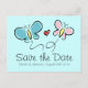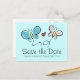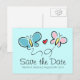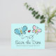 La mariposa caprichosa salva las postales del boda de fecha. Diseño romántico de ilustracion de dos mariposas blancas que se parecen a la novia y al novio con un corazón de amor rojo en el medio. Color de fondo personalizado, es decir, menta.