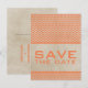 Moderno con un toque vintage es esta Moda Chevron Guardar la postal de fecha. Este diseño presenta un fondo de papel antiguo y un patrón de chevron zigzag en naranja. Fácil de personalizar, simplemente añada los detalles de su boda. Haga clic en "Personalizar" para encontrar más opciones de personalización.