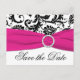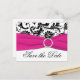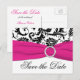 Este damasco negro, blanco y fucsia ahorra la fecha de la tarjeta postal que coincide con las invitaciones de boda y otros elementos que se muestran a continuación. Si necesita cualquier otro elemento coincidente en este diseño, envíe su solicitud a niteowlstudio@gmail.com.
