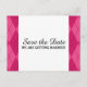 Clásico y elegante estilo Argyle Guardar la postal de fecha con un sencillo fondo de argyle de diamante rosado. Fácil de personalizar con los detalles de su boda. Para obtener más opciones de personalización, haga clic en el botón Personalizar.