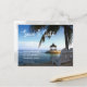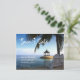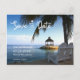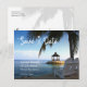 Esta tarjeta Save the Date es ideal para anunciar un boda temático sobre la playa o el océano. Cuenta con una hermosa imagen de una playa tranquila al amanecer. La imagen incluye agua de playa, palmeras, dos tumbonas y un cenador. Este diseño es cálido y acogedor y perfecto para disfrutar de un lado del mar o de un boda de verano. Las palabras "Save the Date" (Salven la fecha) se hacen con letras lúdicas y suaves, con un detalle de corazón para un toque romántico. Esta es la tarjeta perfecta para una boda de destino.