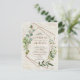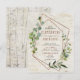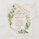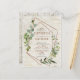 Moderna y de moda, esta invitación a la boda de postal presenta un falso diseño geométrico de cobre adornado con vegetación eucaliptos de color agua, sobre una falsa textura de corteza blanca de abedul. Los nombres de la pareja y algunos detalles de los bodas están en un color de cobre similar, y en la parte trasera de la postal hay un estante de abedules. Copyright Elegant Invita. Todos Los Derechos Reservados.