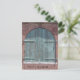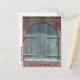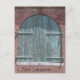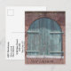 Puerta de almacén abovedada con aceros en un edificio de ladrillo rojo. Texto delante de la tarjeta "Nueva ubicación ...". Personalice en la parte posterior con el nombre de la empresa, la dirección y el número de teléfono.