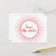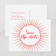 Sofisticado y elegante Deco Retro Salvar la postal de fecha en rojo con un diseño circular de arte deco ornamental de la explosión del sol. Fácil de personalizar, simplemente agregue los detalles de su boda en los campos de texto proporcionados. Haga clic en "Personalizar" para encontrar más opciones de personalización.
