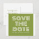Retro Guarde la Postcard Date en verde oliva y blanco con un diseño de tipografía moderna y divertida. Esta moderna y elegante tarjeta postal de fecha es fácil de personalizar con los detalles de su boda. Para obtener más opciones de personalización, haga clic en el botón Personalizar.