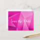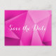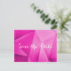 Boda de tonos de joyas nítida y moderna Ahorra la postal de fecha con un fondo de triángulo geométrico funky magenta. Esta moda y diseño sencillo es una elección única para anunciar un boda moderno. Fácil de personalizar con los detalles de su boda. Haga clic en "Personalizar" para encontrar más opciones de personalización.