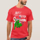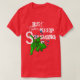 Un pescado lindo del dibujo animado con un tiburón en el fondo con las palabras "apenas guarda el nadar" en una camiseta.