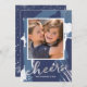 Difunde alegría en el Año Nuevo con esta tarjeta de fotos navideñas moderna que presenta "feliz año" en escritura a mano alzada sobre un fondo pintado abstracto con lámina plateada falsa y tonos de azul. Fotografía de Storytree Studios, Stanford, CA