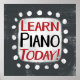 "Learn Piano Today" es un lindo diseño de texto en gris con texto en negro y rojo. Se sienta sobre una forma de acento blanco y sobre los adorables puntos de polka blanco que la rodean.