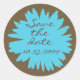 Una flor de gerbera turquesa es la silueta de un fondo polka-punto marrón. "Guardar la fecha sobreimprime la flor. Personalice el pegatina con su fecha de evento. Disponible en colores alternativos con productos coincidentes.